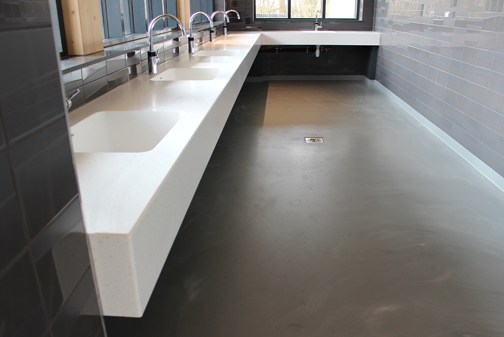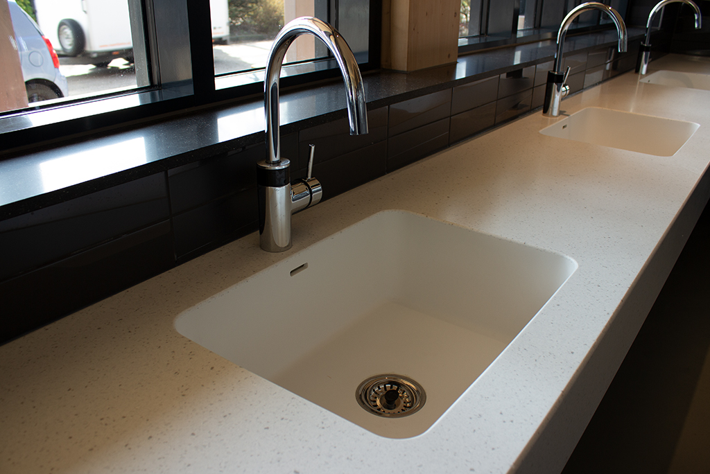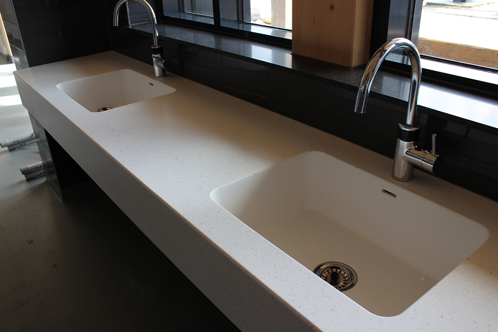 Hier is gekozen voor het wandtype Primo – F – Vrijhangend van Kemmlit. De wastafelbladen zijn uitgevoerd in volkunststof fabrikaat HI-MACS.